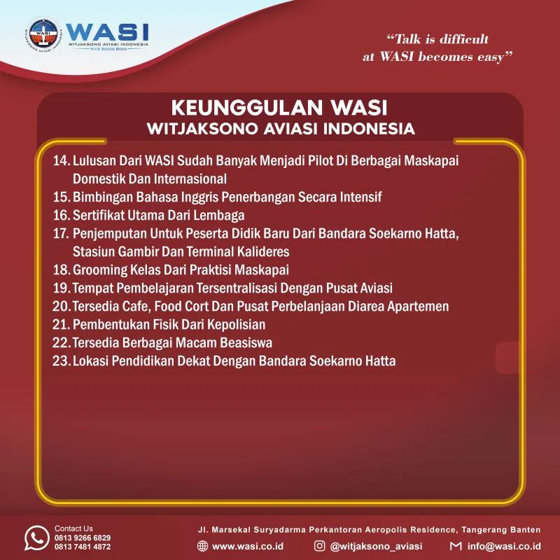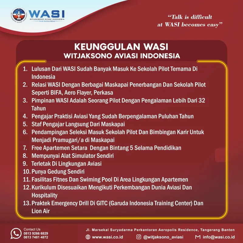 WASI ( Witjaksono Aviasi Indonesia ) dapat membantu anda menguasai kemampuan-kemampuan yang dibutuhkan dalam dunia Aviasi sehingga anda menjadi kompeten di bidang yang dibutuhkan dan memperbesar peluang anda bekerja di dunia Aviasi!